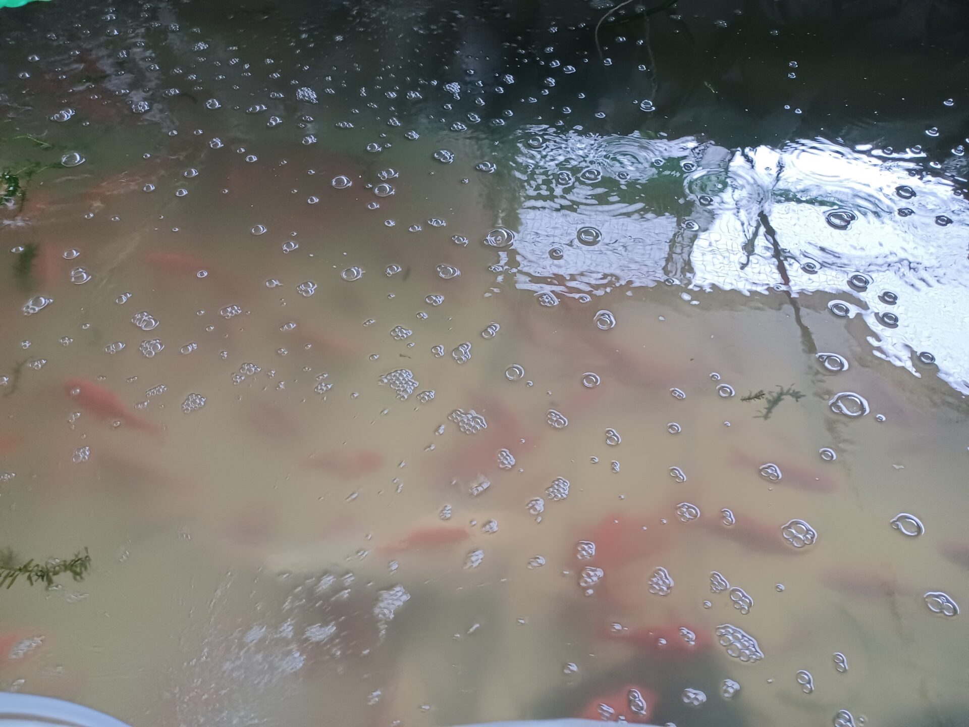 仮住まいの鯉の仮設プール、手作業でいくら水を交換しても200匹以上の鯉が小さなプールにひしめき合って生活しているので、水交換が追いつかず、すぐに濁ってしまいます。