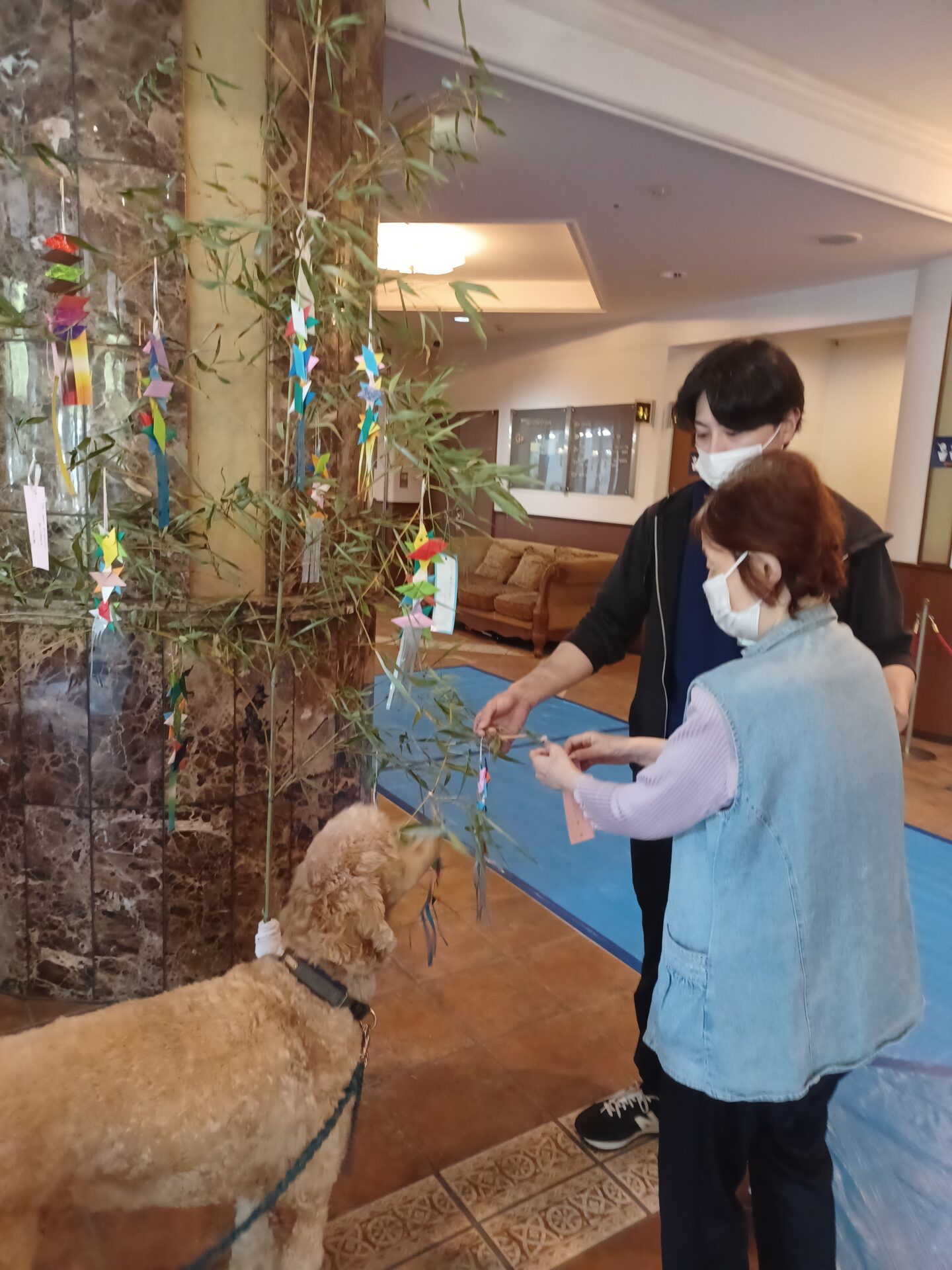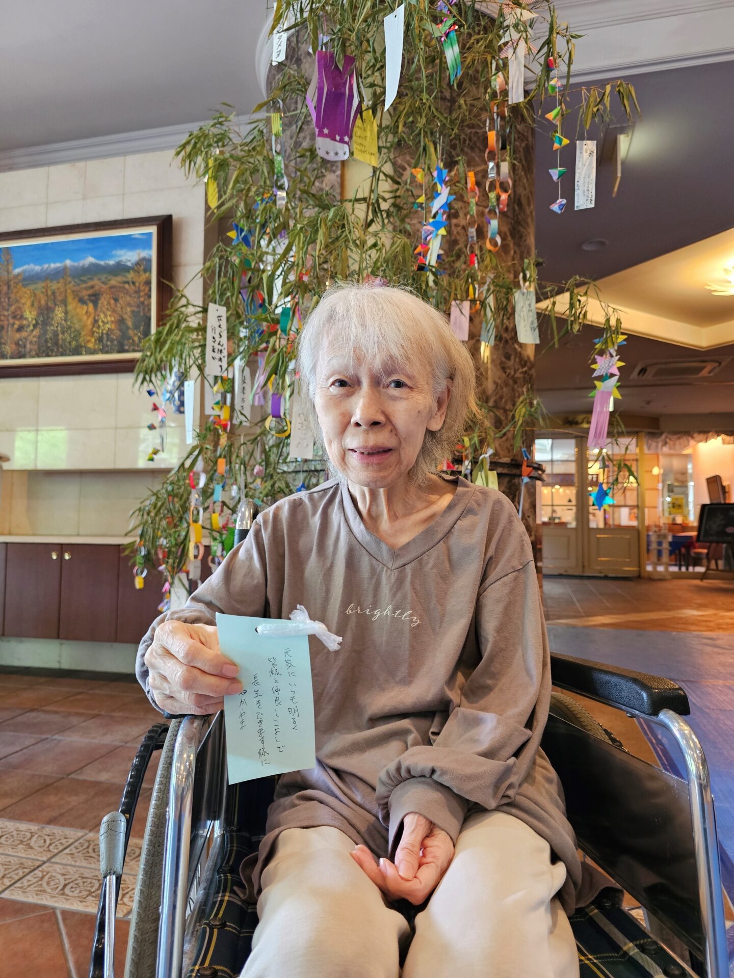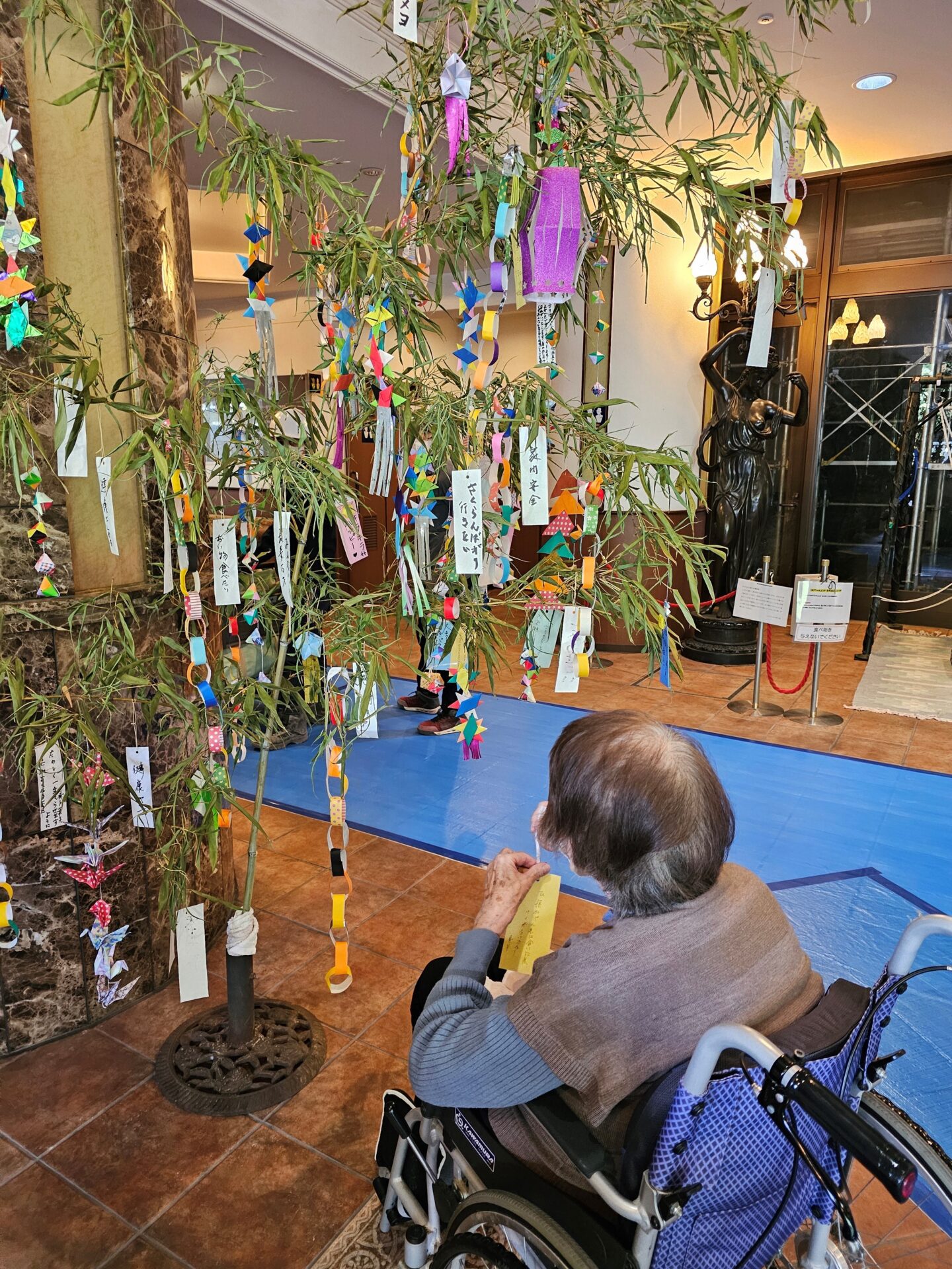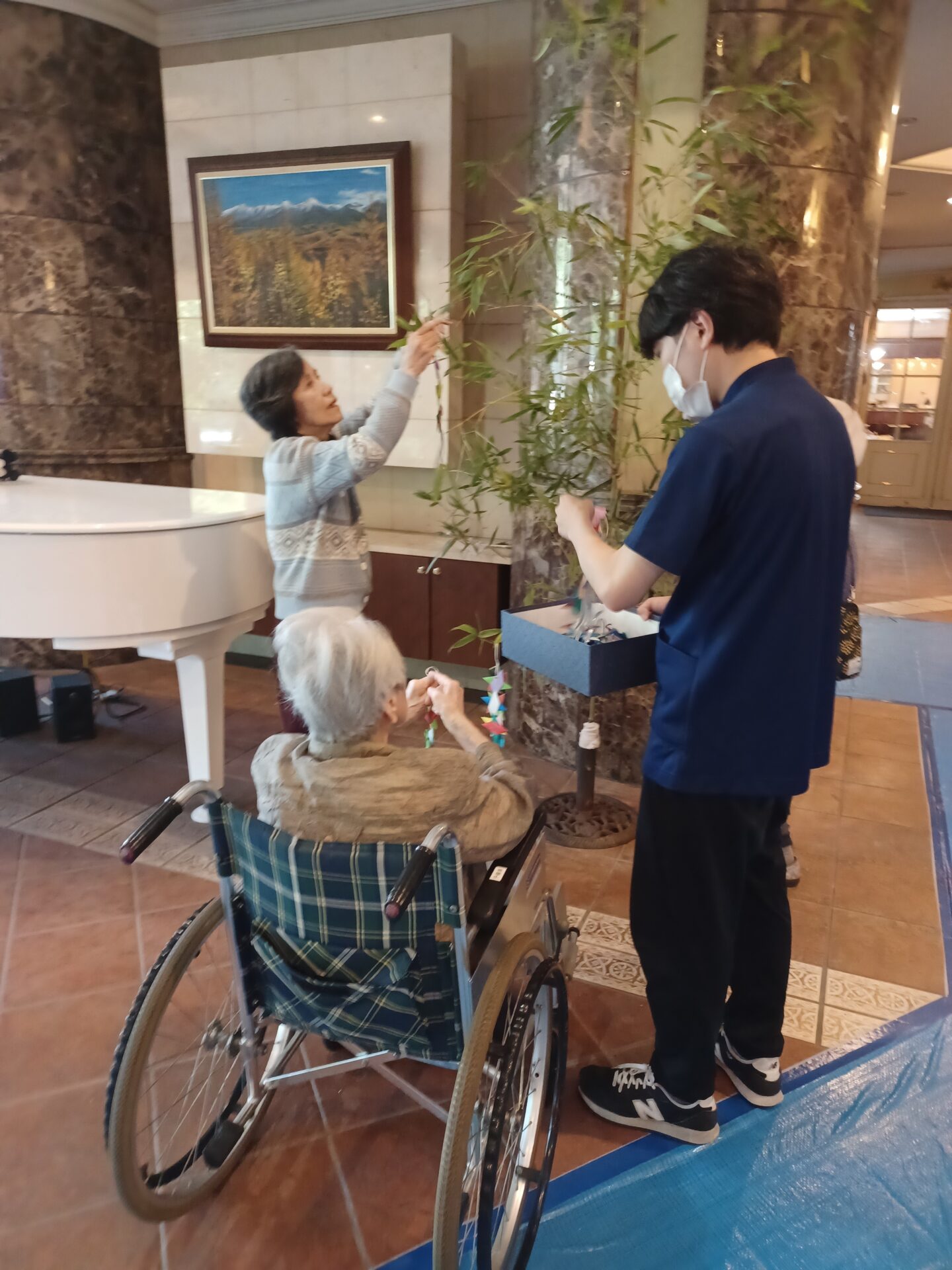 七夕のお飾りは、ご入居者が心を込めて作ってくださったものです。