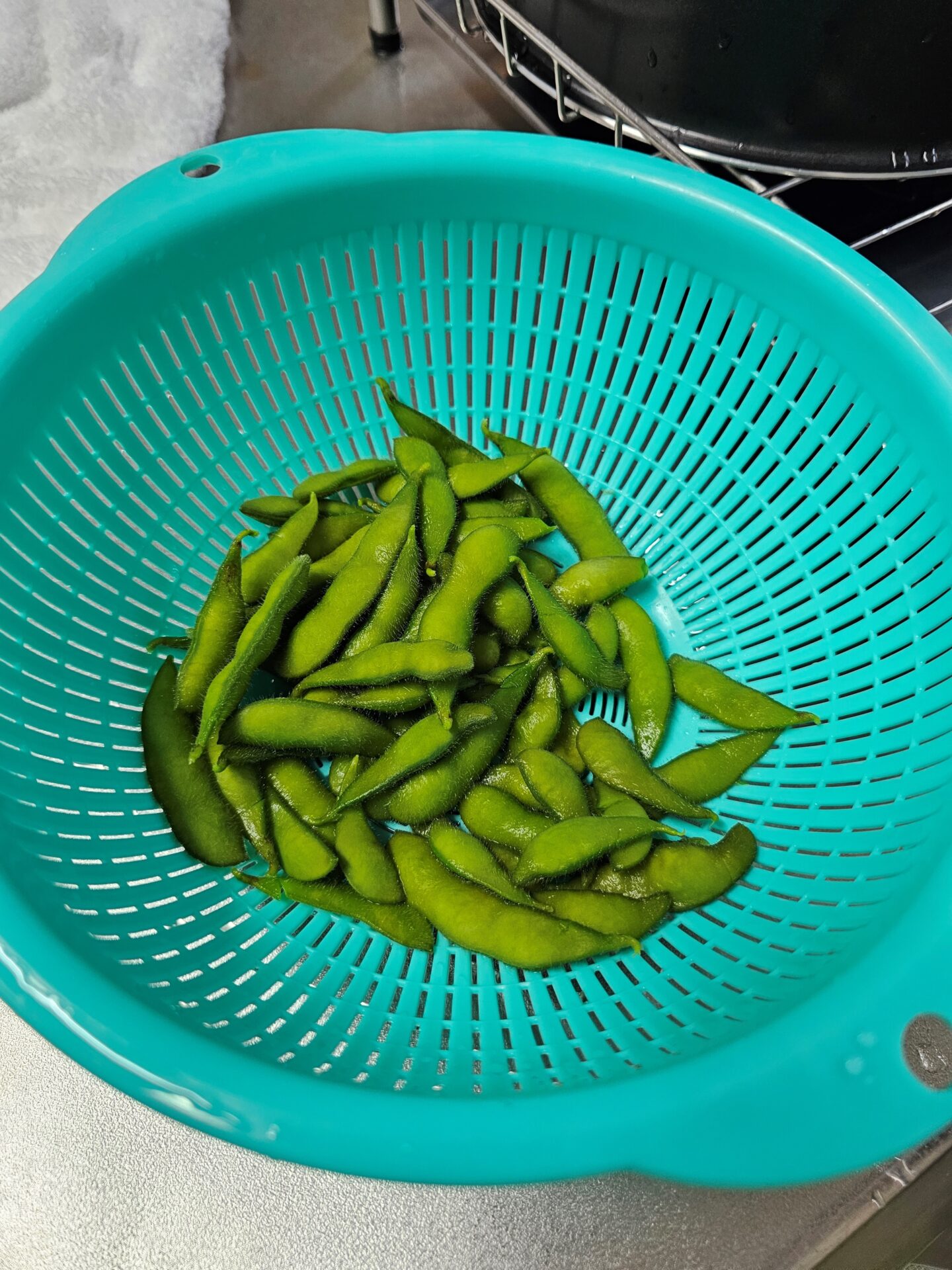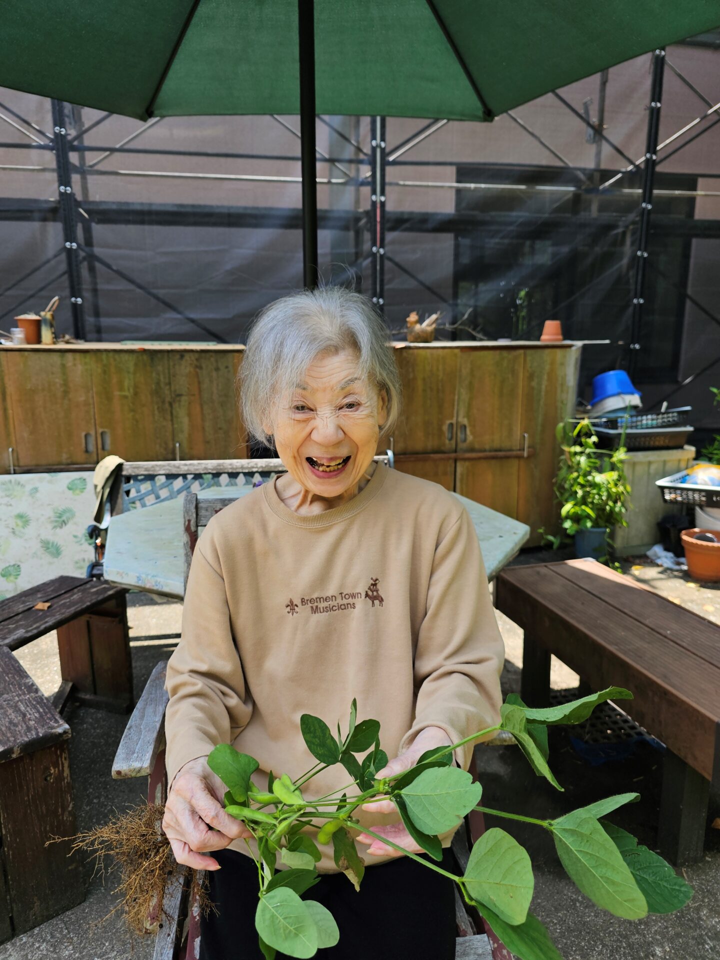 ご入居者にお手伝い頂いて、収穫したエダマメです。