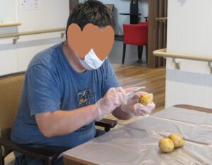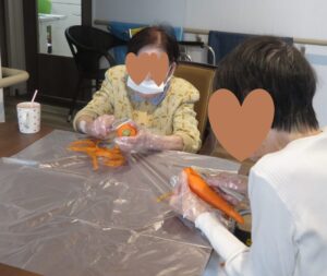 みなさんで人参やじゃがいもの皮を剝く作業から始まります