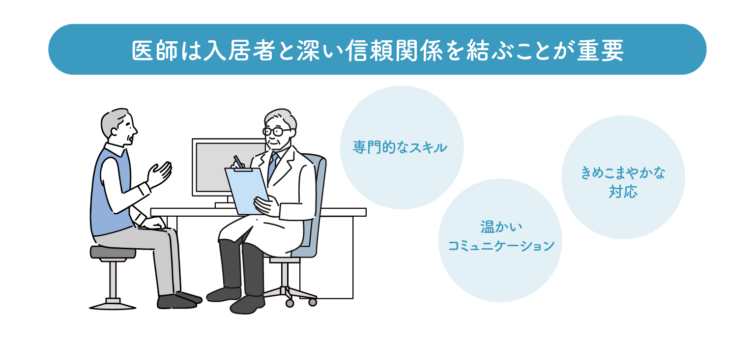 特別養護老人ホームの医師は、入居者と信頼関係を築くことが重要です。入居者が安心して健康相談や症状の報告を行えるように、医師はコミュニケーションに配慮し、温かい対応を心掛けています。