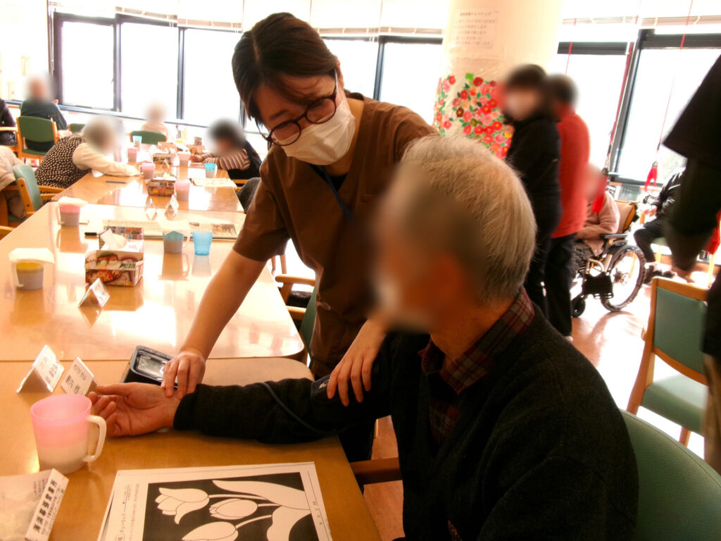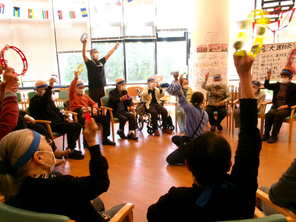 緑溢れる団地の一角にある当施設のデイルームは解放感あふれるフロアとなっており、レッドコード・平行棒等の機能訓練に手芸・麻雀・カラオケ等のレクリエーションを行っております。また、近隣の園児との交流や調理、演奏会等イベントも多数、開催しております。