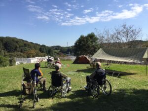 緑に囲まれた中で日光浴を楽しめる屋上は、皆様のお散歩コースの一つとなっています。また、各ユニットが企画してキャンプを開催したり、ボール遊びをしたりと、体を動かしリフレッシュできる場として活躍しています。