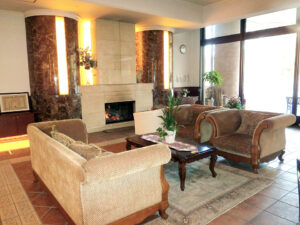 エントランスロビー内には、冬になると暖かな炎が灯る暖炉があります。