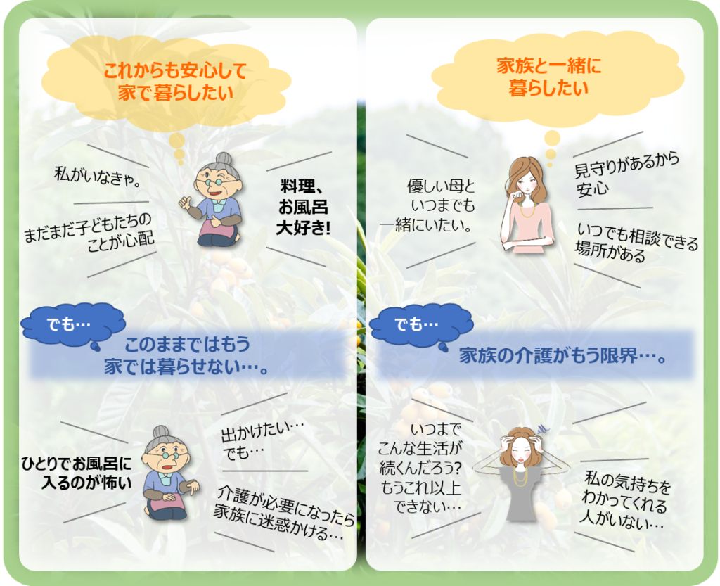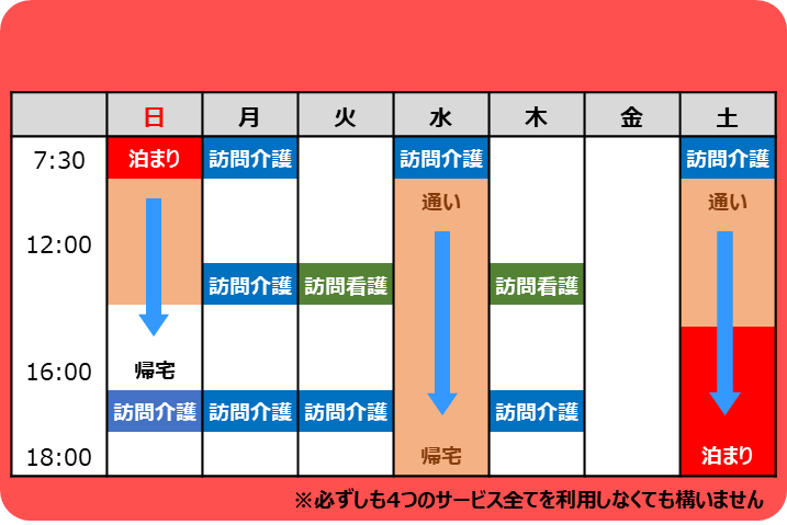 「高齢者世帯の方」「一人暮らしの方」「働きながら介護をされている方」「退院したが不安でサポートのほしい⽅」には特におすすめで、事業所のケアマネージャーが、4つの介護サービスを利用者様に合わせて柔軟にケアプランを作成します。