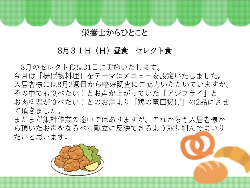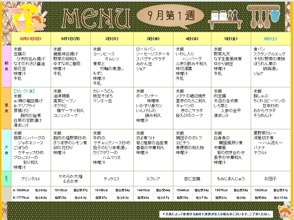 9月第1週献立表(8/31~9/6日)