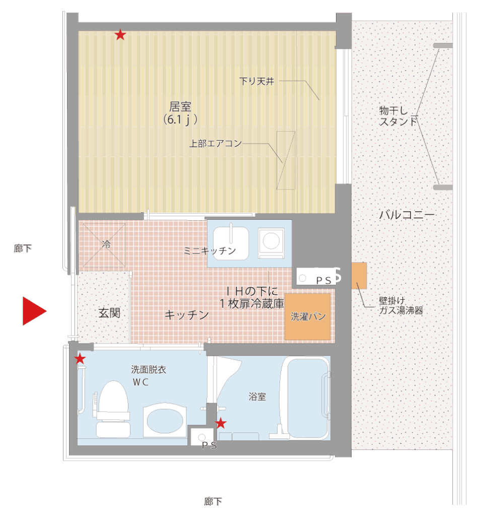 各戸、建物内クローゼットのご用意がありますので、室内は収納スペースを抑えて、広く使うことができます。