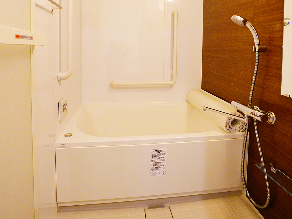 シャワーも配された浴室は、入浴しやすいように浴槽周りに手すりを配したり、床面も滑りにくいタイプのものを使用しています。