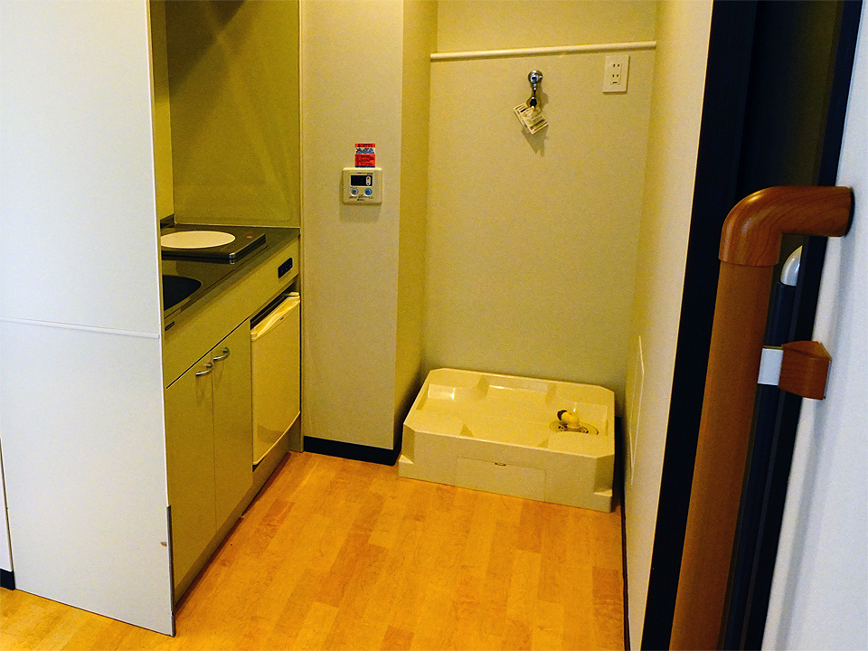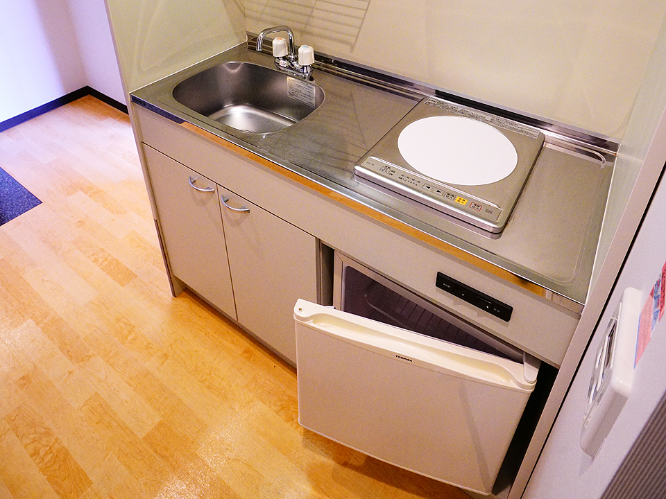 1口IHコンロが配備されたミニキッチンで、自室にて簡単な調理が可能です。1枚扉の冷蔵庫や、簡単な調味料ラックも配備されています。