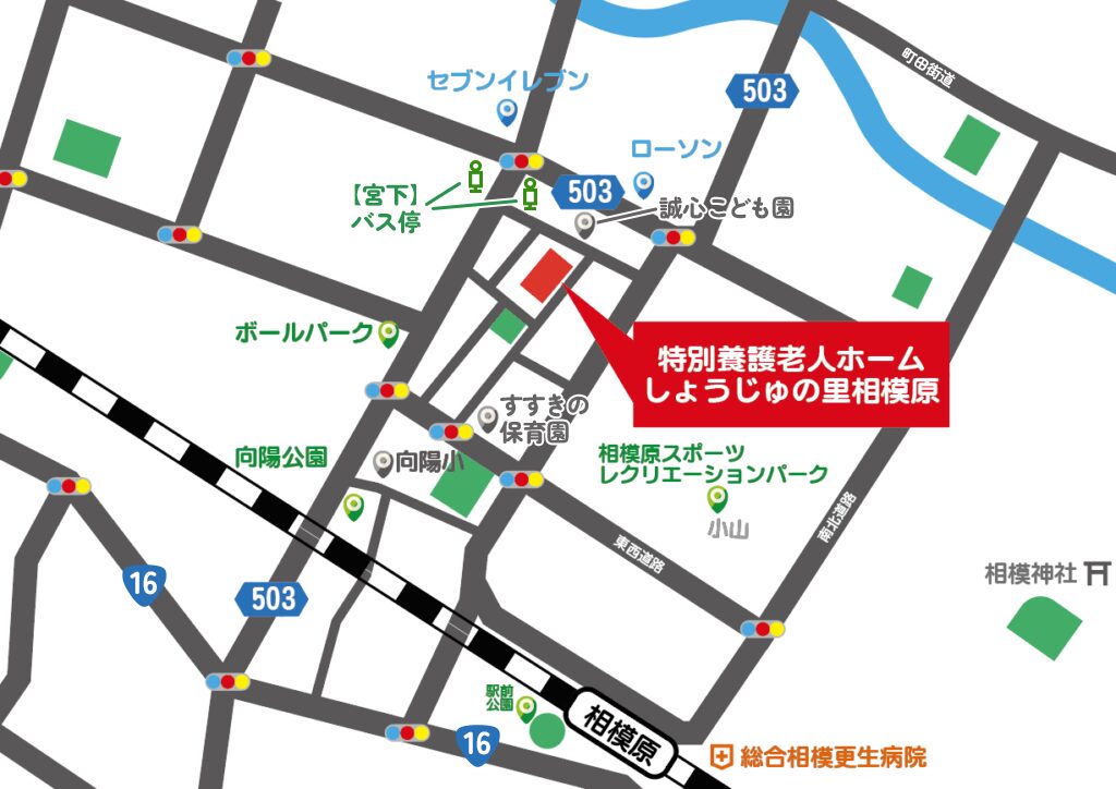 JR横浜線 相模原駅下車 駅の北口から徒歩 約15分(1.3 km) → Googleマップへ