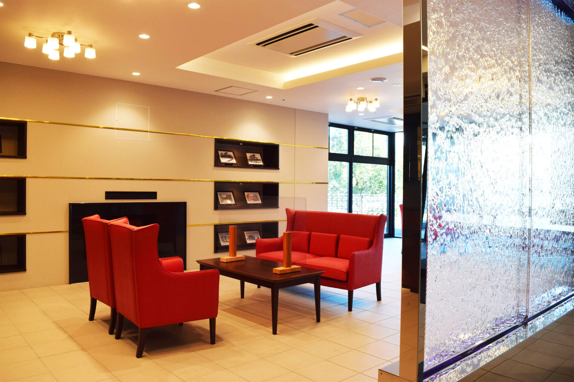エントランスを入るとパネルには滝が流れ、白と黒を基調としたスタイリッシュなロビーが待ち受けます。