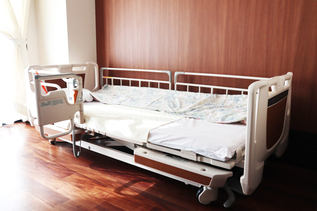 居室は「全て個室」となっており、ベッド、テレビ、洗面台、クローゼットも完備しています。また、お部屋には今までお使いになられていた家具をお持ち込みいただき、ご使用いただくことができます。