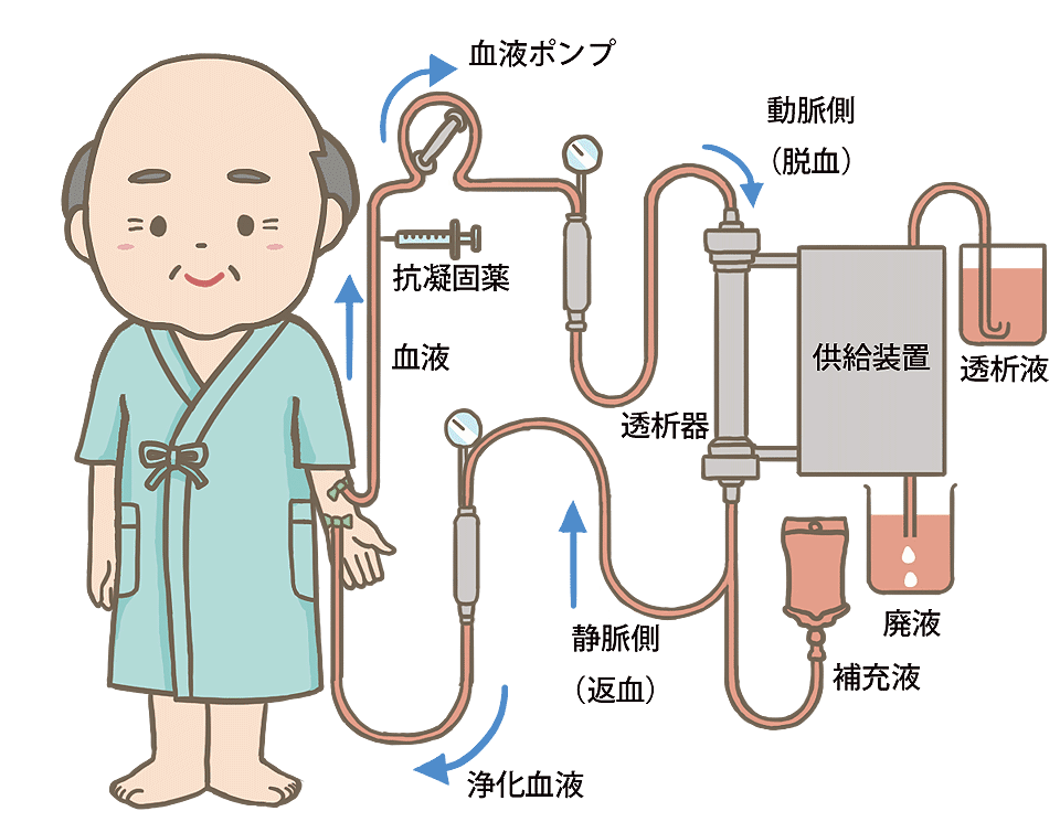 『ダイアライザー』という血液透析器を通して、血液を体内から取り出し、血液中の老廃物や余分な水分を取り除いた後、浄化された血液を体内に戻す治療方法です。