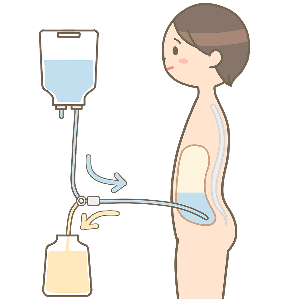 腹膜透析は、お腹の中に透析液を入れ、体内で血液を浄化する方法です。